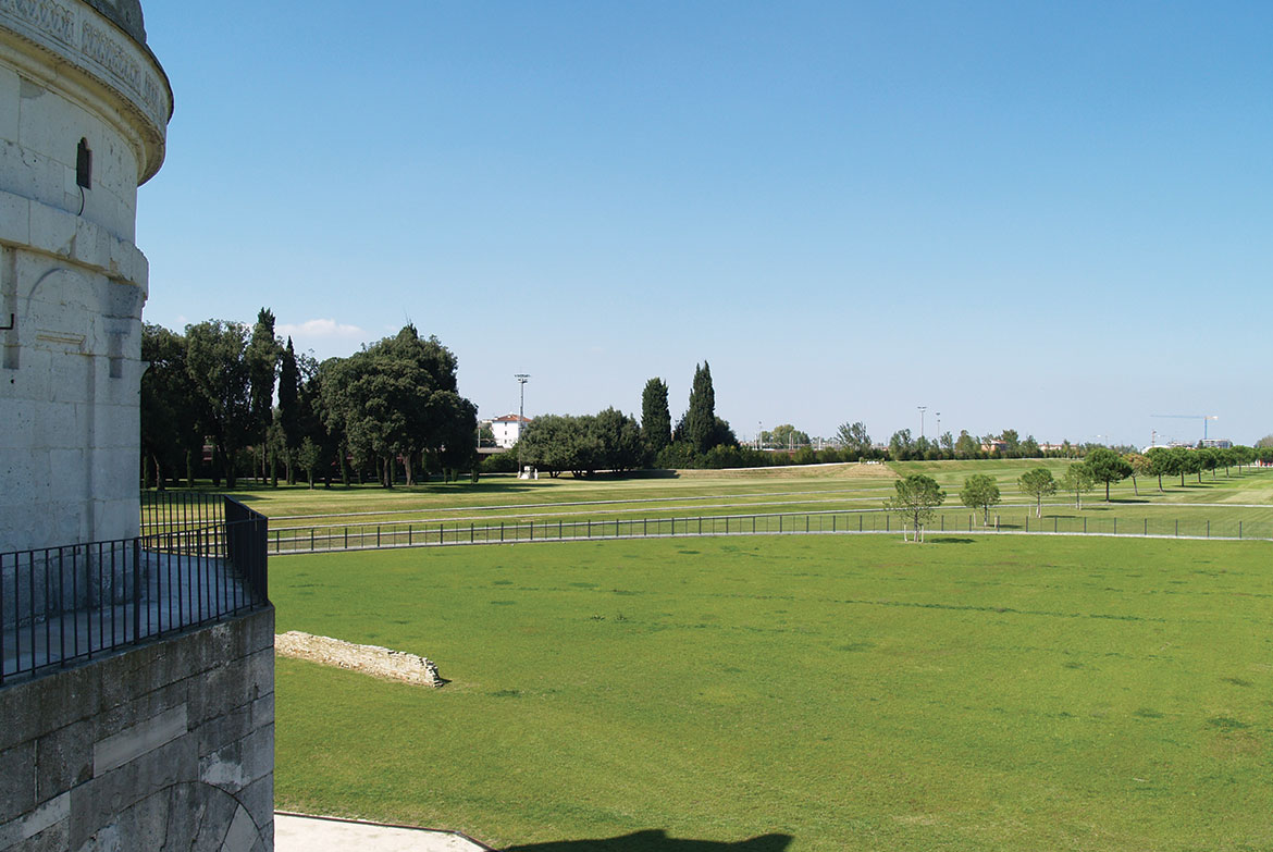 Four prospects converge on it and are the regulative elements and generators of the entire project. The long “monumental” one, marked by a row of cluster pines, leads to the original level of the floor of the Mausoleum. The “distant” one, from the top of the embankment where the bicycle lane is, lets you see it from an unusual point of view. The “domestic” one leads the visitor, amid flowers and shrubs, to the lower cell of the Mausoleum, while the last and “sudden” one opens up at the top of a narrow stairway between two high walls where you discover it with surprise, in its entirety and monumentality.